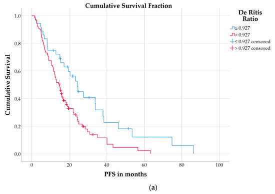 AST, ALT, and CgA were determined <4 weeks before application of the first cycle of PRRT (De Ritis ratio = ALT/AST). PFS was defined as the time from the first cycle of PRRT until detection of progressive disease according to the response evaluation criteria in solid tumors (RECIST) 1.1 or death from any cause [47].