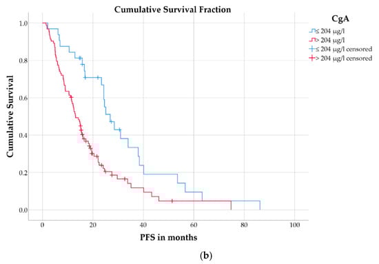 Patients with a high De Ritis ratio (>0.927) had a significantly shorter PFS (median: 14.7 months; IQR: 7.1–24.3 months) than patients with low De Ritis ratio (median: 24.3 months; IQR: 8.5–38.4 months; log-rank test: p = 0.006; Figure 2a). Patients with a high CgA (>204 µg/L) also had significantly shorter PFS (median: 13.1 months; IQR: 6.7–22.5 months) than those with low CgA (median: 26.9 months; IQR: 16.6–38.4 months; p = 0.001; Figure 2b).