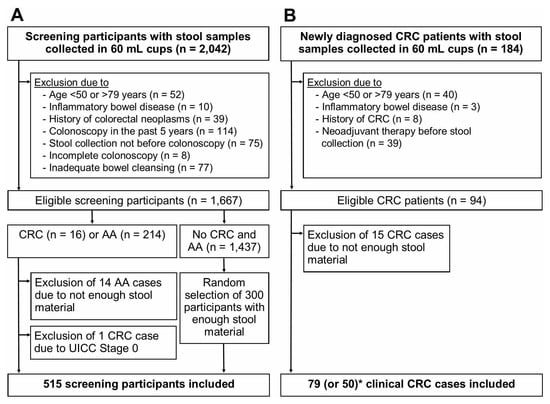 Flow diagram of study participants. (A), BLITZ study (screening setting); (B), DACHSplus study (clinical setting); * for two FITs (Eurolyser FOB test and OC-Sensor), only 50 CRC cases from DACHSplus were included in the final analysis. Abbreviations: AA, advanced adenoma; CRC, colorectal cancer.