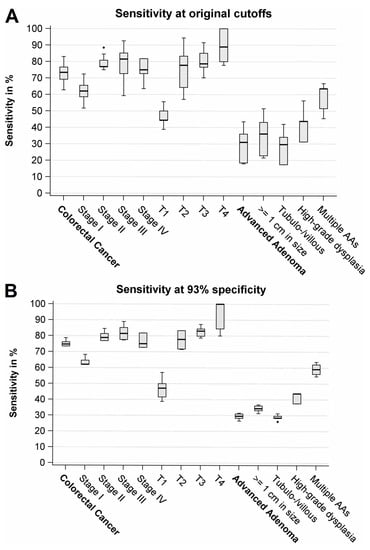 The observed gradient in sensitivities with increasing UICC stage was even stronger than the gradient estimated in a previous meta-analysis [] where pooled sensitivity for more advanced cancer stage was by up to ~15% points higher than for stage I cancers. However, in a recent study [] including 435 newly diagnosed CRC cases, a similarly strong difference in sensitivity by up to ~35% points between stage I and more advanced stages (II-IV) was observed. Furthermore, two previous studies [,] found an even stronger difference (by ~50% points) in sensitivity between stage I and more advanced cancer stages. With respect to T status, in the aforementioned meta-analysis [], the observed difference between pooled sensitivity for T1 and T2–T4 cancers (by up to ~40% points) was also less pronounced than in our analysis (by up to ~60% points). However, FIT sensitivities varied widely across the included studies [], which possibly affected the observed differences. Yet, Hirata et al. [] and Kim et al. [] also found a similarly strong difference in sensitivity between T1 and more advanced T statuses (by ~60–70% points), and in a recent publication [], the difference between T1 and T2–T4 cancers ranged up to ~50% points. Furthermore, we found that sensitivity was the highest among T4 cancers. Even though larger tumors tend to bleed stronger, a previous study [] found lower sensitivities in T4 compared to T3 cancers and hypothesized that clinically manifest anemia lowered FIT sensitivity in T4 compared to T3 tumors. Future studies might consider stool and blood hemoglobin levels to investigate this topic in detail. Previous studies suggested consistently higher sensitivities of FIT for distal CRC compared to proximal colon cancers []. However, those studies did not differentiate between tumors in the distal colon and tumors in the rectum. To our knowledge, only one previous study [] reported sensitivities for distal colon cancer and rectal cancer separately. In our study, we evaluated for the first time the sensitivities for distal colon and rectal cancer separately for a large number of different FITs and found a consistently (albeit not statistically significantly) higher sensitivity for rectal cancer compared to distal colon cancers for all FITs, although there was no participant with T4 cancer among the rectal cancer cases. Interestingly, among participants with a single AA, sensitivities were highest for distal AA cases and lowest for proximal AA cases, although statistical significance was not reached. Future studies reporting on sensitivity according to location should thus consider additional stratification of distal advanced neoplasms into those located in the distal colon and rectum.