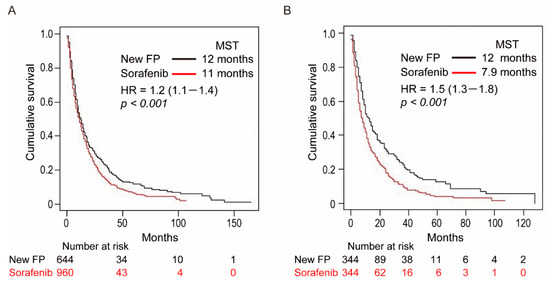 Overall survival curves of patients in the New-FP and sorafenib groups. (A) New-FP (n = 644, black line) and sorafenib (n = 980, red line) before propensity score matching, p < 0.001. (B) New-FP (n = 344, black line) and sorafenib (n = 344, red line) after propensity score matching, p < 0.001. Abbreviations: MST, median survival time; HR, hazard ratio.