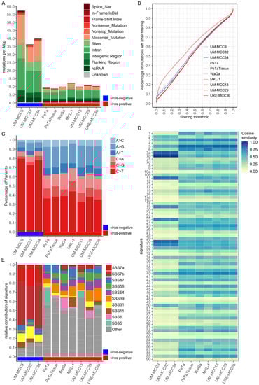 Virus-negative Merkel cell carcinoma (MCC) cell lines show high tumor mutational burden (TMB) and presence of UV-light-induced DNA damage, while virus-positive cell lines have low TMB and lack prominent signatures; (A) Mutational burden in mut/Mbp, color-coded by variant classification; (B) Filtering of polymorphisms in MCC cell lines showing the relative decrease in TMB (y-axis) with increasing variant allele frequency (VAF) threshold (x-axis) from gnomAD genome database; Figure S1A depicts the same plot with log-transformation of x-axis; (C) Contributions of base-pair transitions for single nucleotide variants (SNVs), normalized by total number of SNVs. Complementary transitions are merged in one category (e.g., G > A and C > T as C > T); (D) Cosine similarity between trinucleotide context frequencies (TCFs) of MCC cell lines and reference signatures reveals two distinct patterns for virus-positive and -negative cell lines; (E) Signature contribution of MCC cell lines after fitting to reference signatures. Signature contributions are normalized to total number of SNVs in the respective cell line. Signatures not reaching at least 10% contribution in at least one sample are summarized as “Other”. Abbreviations: mut/Mbp: Mutations per Megabasepair, SBS: Single Base Substitution.
