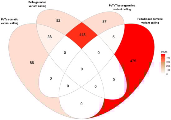The Maftools R package v2.0.05 was used for VCF to Mutation Annotation Format (MAF) conversion using ensemble genes as gene column, and used for manipulation of MAF files in R []. Variants that are not within the probe region of the SureSelect All Exon V6 Kit were removed from analysis. Variants from germline variant calling were filtered and removed from analysis if one of the following criteria was met: SNVs with QD < 2.0, MQ < 50.0, FS > 60.0, SOR > 5.0, MQRankSum < −12.5 or ReadPosRankSum < −8.0 and InDels with QD < 2.0, FS > 200.0, SOR > 10.0, InbreedingCoeff < −0.8 or ReadPosRankSum < −20.0. For evaluation of subsequent filtering of possible polymorphisms, we compared different databases reporting VAFs (Figure S1B,C). Based on this analysis, we filtered a variant as germline polymorphism if it reported a VAF of more than 0.001% in gnomAD v2.1.1 genome. Variants from somatic variant calling of Peta/PeTaTissue were filtered using GATK FilterMutectCalls and not filtered for germline polymorphisms.
