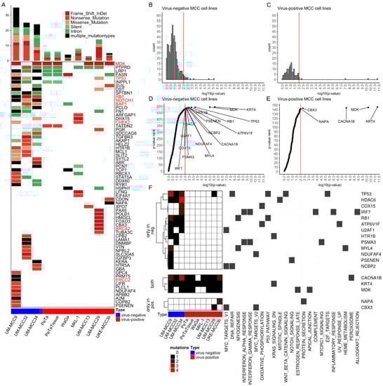 Virus-negative MCC cell lines have high number of coding mutations altering protein structure and significantly mutated genes. (A) Oncoplot showing genes selected by the following criteria: (i) containing either a frameshift InDel, nonsense or nonstop mutation and (ii) it is either within a Hallmark Gene Set or its mutation is annotated as pathogenic in ClinVar database. The number of mutations within the selected genes are depicted as bar chart. Both plots are colored by variant classification. Genes emphasized in red are discussed in the results section; (B–E) Distribution of p-values for identification of SMGs as histogram (B,C) and ranked by p-value (D,E) for virus-negative (B,D) and -positive (C,E) MCC cell lines; only genes present in Hallmark Gene Sets were taken into account, red lines indicate a p-value of 0.01, genes with a p-value of exactly 1 are not shown; (F) Mutational burden and involvement in biological processes of SMGs with p-value below 0.01 and presence in Hallmark Gene Sets. Abbreviations: MCC: Merkel cell carcinoma, InDel: Insertion and deletion, SMG: Significantly mutated genes.