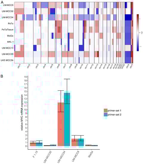Local amplifications of MYCL on chromosome 1 have previously been reported for both MCC types [,,,]. Here, MYCL is included in the whole-chromosome gains of UM-MCC29 and UM-MCC32 as well as the partial chromosome gains in UM-MCC34. Interestingly, UM-MCC34 has an extraordinarily high, localized amplification of MYC (aka c-MYC), with 106 copies covering ~530,000 basepairs on chromosome 8. MYC is also included in larger whole- or partial-chromosome gains in UM-MCC29, WaGa and UM-MCC9. These amplifications are associated with a higher MYC mRNA expression, which is most pronounced in UM-MCC34 (Figure 4B).