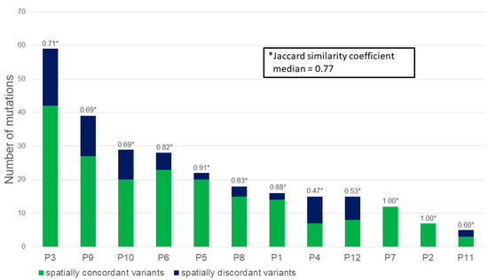 The number of non-synonymous, exonic mutations per patient with an allelic frequency of at least 10% in one of the samples. Concordant mutations that were found in all the biopsies are shown in green and discordant mutations that were not detected in at least one of the samples are shown in blue. The Jaccard similarity coefficient, indicating the similarity within the samples is given above the bar for each patient. The closer the coefficient is to one, the more homogeneous the lymphoma mass was.