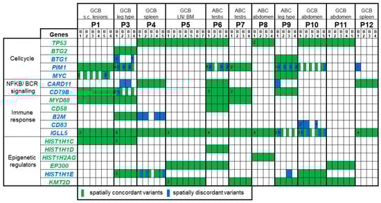 Selected genes with a known relevance for lymphoma biology. Concordant mutations which were found in all biopsies (B) are marked in green and discordant mutations which were found with an allelic frequency of at least 10% in one of the samples of a patient but not detected in at least one other are shown in blue. In some genes, several mutations were found in one patient. If multiple mutations were found, the number of mutations is given within the cell.