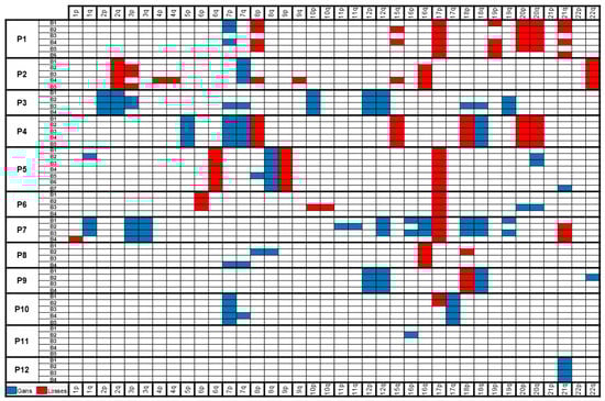 The copy number variants for all the biopsies (B) of each patient. Gains are shown in blue and losses in red.