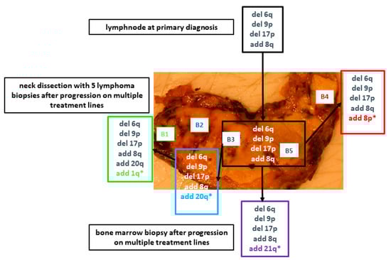 Seven biopsies of patient 5 and the detected copy number variants (CNVs). A biopsy of a single lymph node at primary diagnosis was available from this patient, which is shown at the top of the figure. The picture, in the middle of the figure, shows the specimen of the lymph node dissection which was carried out after the patient’s tumour progressed on multiple treatment lines. Shortly after the neck dissection, a bone marrow biopsy was performed and the results of the CNVs are shown at the bottom of the figure. All the samples share a complex genotype but additional CNVs (*) in some biopsies show both, spatial heterogeneity as well as clonal evolution over time.