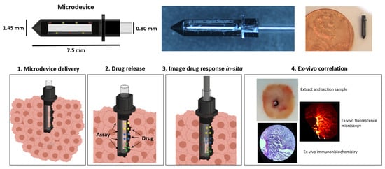 Schematic (top left) and actual image (top center and top right) of the lab-in-tumor implantable microdevice (LIT-IMD) containing multiple reservoirs for drug and assay release and a hollow inner lumen with optical window face. Bottom row demonstrates overall functionality: 1—LIT-IMD is implanted into a live tumor; 2—LIT-IMD releases multiple drugs into discrete confined tumoral tissue and in parallel, releases fluorescent cell death assay into drug-exposed tissue; 3—fluorescence imaging probe is passed coaxially into the LIT-IMD for real-time evaluation of drug diffusion and cell death response; 4—correlation was performed to validate this method by removing and sectioning tissue at each drug-exposed site and comparing in situ fluorescence imaging signal with conventional benchtop fluorescence microscopy and immunohistochemistry of processed tissue sections.