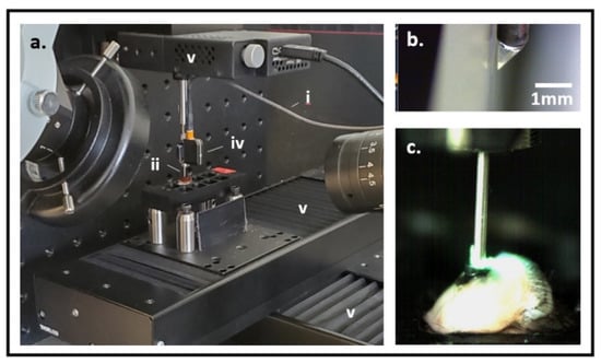 The probe both delivers light excitation and also collects the resultant fluorescent signal. The system operates in an epi-fluorescence manner, and the collected fluorescence images are received by two separate CCD cameras for both channels, one centered at 630 nm (red channel) and the other at 530 nm (green channel). The miniaturized optical imaging probe is mounted on a 4-axis stage system consisting of three linear stages (Thorlabs) for precise X-Y-Z movement and a fourth rotational stage (Figure 2a). The stages are controlled electronically using commercially available software (Thorlabs). Control of the M-2CFM system and subsequent imaging display from the CCD camera are also performed in real-time using commercially available software (Doric). There were two microscope cameras (Motic Instruments, Schertz, TX, USA) used to confirm satisfactory positioning and alignment of the imaging probe, and to ensure that the microdevice does not migrate within the live tumoral tissue during imaging.