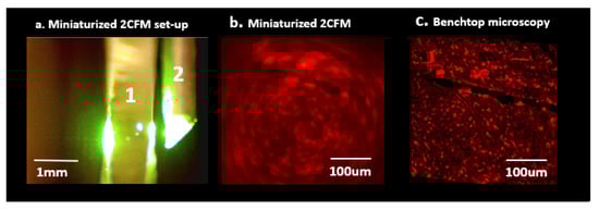 Performance of the customized M-2CFM imaging system was evaluated using a 10-μm thick tissue section containing fluorescently stained macrophage cells (Figure 3). The optimal working distance of the M-2CFM system was 200 μm and the field of view was ~400 × 400 μm. The in-focus resolution was sufficient to detect individual cells as small as 10 um in diameter, based on correlation with a benchtop fluorescence microscope system (Figure 3b,c). Fluorescent signal remained visible at up to 300 μm distance from the probe. Therefore, in bulk tissues, the received images represent an accumulated effect of fluorescent signal excited within a depth of ~300 μm of the probe.