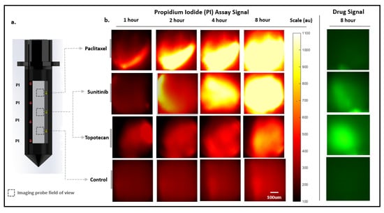 The chemotherapy agents were loaded into the microdevice in consecutive reservoirs as shown in Figure 4a. The PI assay formulation was loaded on the opposite wall of the microdevice into four contiguous reservoirs (Figure 4a). This formulation and loading scheme optimized equal diffusion of PI into each drug-exposed tissue region, upon delivery of the LIT-IMD into live tumor tissue.