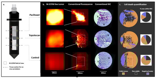 Conventional fluorescence imaging of the processed tissue sections was performed as a gold standard measurement in the red and green channels using a commercial benchtop fluorescence microscope system (Echo Revolve, San Diego, CA, USA). Images for analysis were obtained at 4X magnification with 300 ms exposure time in red (586 nm wavelength excitation, 603 nm emission) and green (495 nm excitation, 519 nm emission) channels. A 400 × 300 μm rectangular region of interest (ROI) was selected at each drug site, corresponding to a representative area evaluated by M-2CFM system in the live tumor (dotted white box in Figure 6b). The mean PI (red channel) signal intensity within the ROI was calculated using Matlab image processing software (Mathworks), as a quantitative measure of cell death.