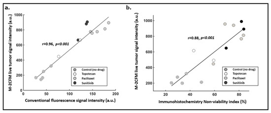 (a) Correlation between the M-2CFM live tumor fluorescence imaging and conventional benchtop fluorescence imaging of corresponding tumor sections (r = 0.96, p < 0.001). (b) Correlation between the M-2CFM live tumor fluorescence imaging signal intensity and a non-viability index calculated from gold standard immunohistochemistry hematoxylin and eosin (H&E) stained sections (r = 0.88, p < 0.001). n = 15 replicate drug sites from five tumors were used for this correlation.
