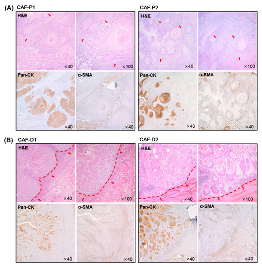 Immunohistochemical analysis of tumor tissues from HNSCC patients. Hematoxylin and eosin (H&E) staining was performed using HNSCC tumor tissues. Representative cancer stroma, including CAF, is shown with red arrows. Pan-cytokeratin (Pan-CK) and α-SMA staining was conducted at the same time to evaluate the epithelial cancer cells and CAFs, respectively. (A) Representative image for CAF-P. (B) Representative image for CAF-D. The boundary between epithelial cancer and adjacent stroma was marked with a red line.