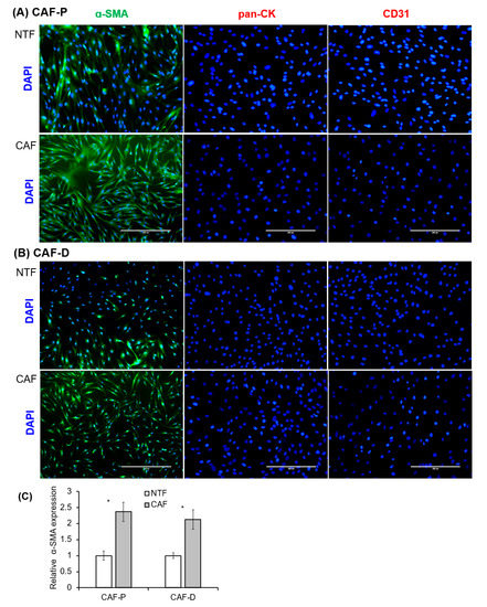After 2–3 weeks of incubation, fibroblasts attached to the culture plate began to grow. All primary fibroblasts exhibited a homogeneous, spindle-shaped fibroblastic morphology. Fibroblasts that express α-SMA are considered the main constituents of the stroma in various cancers [27]. Immunocytochemical staining was performed with primary fibroblast cells cultured from four patients, and representative images from one patient are shown in Figure 2. To confirm epithelial and endothelial cell contamination within the isolated fibroblasts, we examined pan-cytokeratin (Pan-CK) and CD31 expression. The fibroblast cultures were negative for both these markers. Most of the CAF-P and CAF-D cells (>95%) exhibited positive staining for α-SMA. On the contrary, paired non-tumor fibroblast (NTF) cells showed weak-positive or negative signal by fluorescent α-SMA staining. α-SMA expression in primary fibroblasts was quantified by fluoresce image analysis. As shown in Figure 2C, there was no difference between CAF-P and CAF-D groups. However, α-SMA lever is significant higher in CAFs compared to paired NTFs. The expression patterns of these markers were maintained after several passages.