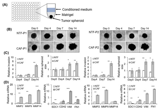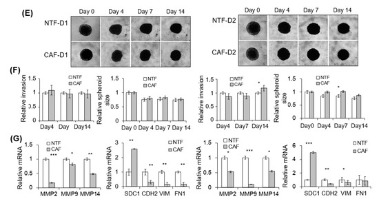 We evaluated the effect of CAFs on 2D Matrigel invasion of HNSCC cells using a Transwell co-culture system (Figure S1A). Compared with CAF-D, the invasion of FaDu cells was significantly increased under co-culture with CAF-P (Figure S1B). The YD-10B cells showed similar pattern with the FaDu cells (Figure S1C). Furthermore, we investigated the effect of CAF-P- or CAF-D-derived condition medium (CM) on the invasive potential of 3D FaDu spheroids (Figure 3A). Considering the difference in CAF characteristics between patients, CAF-paired NTF was also compared. Corresponding differences were noticed in relative invasion (number of sprouts extending from spheroids) and spheroid size. No change was observed in spheroid invasion for four days; however, on day 14, Matrigel invasion by CAF-P-derived CM was enhanced compared with that by paired NTF-derived CM (Figure 3B). Corresponding differences were observed in the relative invasion (number of sprouts extending from spheroids) and FaDu spheroid size (Figure 3C). However, no significant change in Matrigel invasion or FaDu spheroid size was noted under the influence of CAF-D-derived CM for 14 days (Figure 3E,F). NTF-derived CM did not significantly affect Matrigel invasion and spheroid size after 14 days in both groups. Interestingly, MMPs mRNA expression was upregulated in FaDu spheroids co-cultured with CAF-P-derived CM compared with those co-cultured with paired NTF-derived CM (Figure 3D). However, MMP mRNA level remarkably decreased in FaDu spheroids co-cultured with CAF-D-derived CM compared with those co-cultured with paired NTF-derived CM (Figure 3G). Interestingly, mesenchymal markers such as N-cadherin (CDH2), vimentin (VIM), and fibronectin (FN1) showed similar mRNA expression pattern with MMPs at the same condition. Syndecan-1 (SDC1), one of the epithelial markers, showed opposite pattern with that of mesenchymal markers both in CAF-P- and CAF-D-derived CMs. (Figure 3D,G).