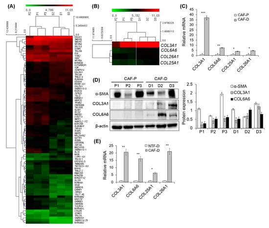 DNA microarray analysis of CF-P and CAF-D group. To evaluate the gene expression difference between CAF-P and CAF-D groups, microarray analysis with six samples of three primary fibroblasts in each group was performed with Affymetrix GeneChip® Human Gene 2.0 ST array. (A) Heatmap of differentially expressed genes among the matched groups with a fold change of >1.75 and p-value of <0.05. (B) Heatmap of COL3A1, COL6A6, COL25A1, and COL26A1 in two groups. (C) The mRNA expression levels of four collagen genes were compared using qPCR analysis in the CAF-P and CAF-D group fibroblasts. (D) Collagen protein expression was compared in the same sample groups. (E) mRNA expression of four COL genes was compared in four sets of CAF-D and paired NTF-D. Results represent the mean ± standard deviation of three experiments (* p < 0.01, ** p < 0.005, *** p < 0.0001).