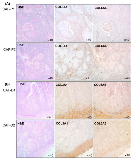 This experiment was performed with tissues collected from four patients, and two sets of representative images are shown in Figure 5. COL3A1 and COL6A6 protein expression levels were higher in the CAF-D group than in the CAF-P group. CAF-P showed a weak positive staining pattern (Figure 5A). Conversely, as shown in Figure 5B, COL3Al and COL6A6 in CAF-D showed more amount of staining along the border of cancer epithelial cells.