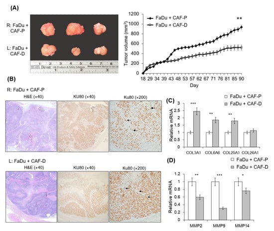 Mouse xenograft tumor formation from FaDu spheroids with CAF-P or CAF-D. FaDu spheroids (<400 μm in diameter) were prepared in 96-well U-bottom Ultra-Low Attachment plates. Overall, 50 FaDu spheroids (approximately 5 × 105 cells) were co-injected with the same number of CAF-P and CAF-D cells into the right and left cheeks of the mouse oral mucosa, respectively. (A) Representative images show the appearance of tumors after sacrifice. At 90 days after injection, tumor size was measured using a caliper. (B) Immunohistochemical analysis of mice tumor tissues was performed with the Ku80 antibody to evaluate whether they are derived from FaDu and human fibroblasts. Representative Ku80-positive cells are indicated with black arrows. (C,D) Collagen and MMP mRNA expression levels in mice tumor tissues were compared. (* p < 0.05, ** p < 0.01, *** p < 0.005).