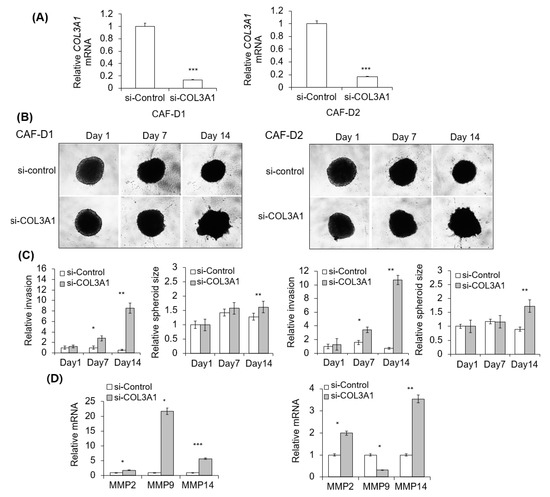 Effect of collagen knockdown-CAF-D on FaDu spheroid invasion. (A) CAF-D cells were transfected with siCOL3A1 for two days, and CM was collected. siRNA efficiency was evaluated using qPCR analysis. (B) FaDu spheroid (400 μm in diameter) was formed by culturing a 96-well U-bottom Ultra-Low Attachment plate for two days. CM and Matrigel were added to each well, and the spheroid invasion was monitored for 14 days using phase-contrast microscopy (5× magnification). (C) Cell invasion was quantified by measuring the mean number of tube-like structures extending from the surface of each spheroid. The spheroid size was quantified using Cell3iMager. (D) MMPs mRNA expression in FaDu spheroids were analyzed using qPCR on day 14. Results represent the mean ± standard deviation of three experiments (* p < 0.05, ** p < 0.01, *** p < 0.005).