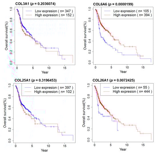 We investigated the effect of COL genes on the survival of HNSCC patients in R (version 3.3.1). Overall survival information is downloaded from TCGA (The Cancer Genome Atlas). As shown in Figure 8, COL6A6 and COL26A1 are strongly associated with longer survival according to the Kaplan–Meier survival analysis.