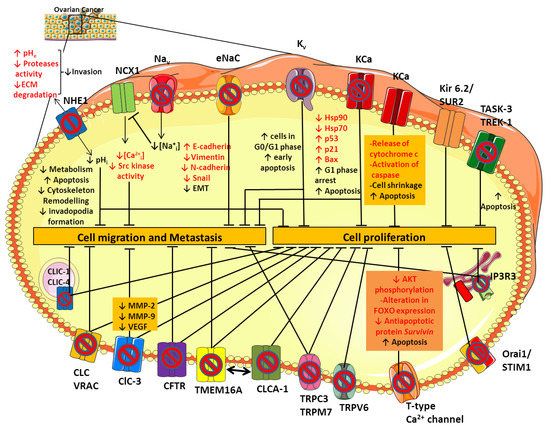 Ion channels expression in ovarian cancer (OC). Schematic representation of the main ion channels and transporters involved in OC development and progression. Their dysregulated role in cell proliferation, migration and metastasis has been studied by modulating their activity with selective ion channel inhibitors. See text for further details.