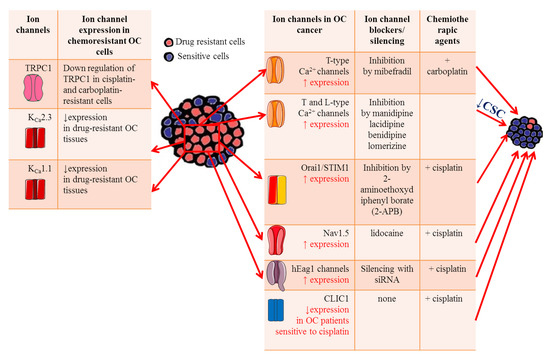Ion channels roles in OC drug resistance. Table on the left summarizes the main ion channels likely involved in OC drug resistance, focusing on their expression level on OC cells and tissues. Table on the right lists the effects of ion channel blockers on chemosensitivity to platinum-based agents.