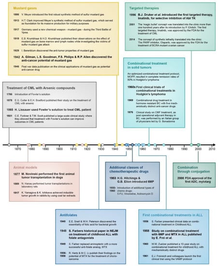 Recorded attempts to cure malignant diseases date back to ancient times. However, modern chemotherapy is about 100 years old and in an almost poetic sense, its beginning could be entitled: “From chemical warfare to cancer therapy”. Indeed, many attribute the birth of modern chemotherapy to the introduction of sulfur mustard gas as a chemical weapon in World War I (WWI), which subsequently led to extensive military research in the pre-World War II (WWII) era and the discovery of its antiproliferative properties [1]. The lethal properties of mustard gas to cells were found to be directly proportional to the rate of cell proliferation. This physiological feature of mustard gas led to the implementation of mustard nitrogen as the first anticancer medication [2]. Mustard nitrogen is a DNA-alkylating agent that represents the first generation of anticancer drugs; toxic agents which are active against all proliferating cells, including normal ones. In this category of drugs also included are DNA intercalators and topoisomerase inhibitors, which were discovered and introduced into the clinic in the mid-1960s. The discovery that cancerous cells are a preferable target for toxic agents was encouraging, yet the overall excitement was restrained, since in a vast majority of cases the therapeutic effect of mustard gas derivatives on cancer patients was transient and patients typically succumbed to the disease shortly after cancer recurrence. Since the first use of mustard nitrogen as an anticancer medication, the evolution of chemotherapy was driven by the development of new laboratory research tools and accumulating knowledge about cancer diseases. The more selective approach of targeting special metabolic needs of cancerous cells relied on an understanding of the hypermetabolic activity of these cells. The first antimetabolite was introduced in 1948 by Sidney Farber and coworkers, who used the folate antagonist aminopterin for the treatment of childhood acute lymphoblastic leukemia (ALL) [3]. Shortly after the introduction of antifolates, a different class of antimetabolic drugs—purine and pyrimidine analogs such as 6-MP and 5-FU were discovered by a rational approach of target-oriented drug discovery [4,5]. Despite the discovery and clinical implementation of new anticancer drugs, the outcomes of single-drug treatments were still very poor, which brought about quick recognition that treatments with multiple drugs are necessary for the improvement of cure rates. Not without strong objections and skepticism from the oncology community, initial drug combination trials took place in the early 1950s, first in childhood acute lymphoblastic leukemia (ALL), and remarkable success of this approach led to its translation to other types of cancer down the road. Of note, the drugs that were used in the early drug combination clinical trials in childhood ALL during the 1950s and 1960s are still part of the foundation of contemporary pediatric ALL treatments with survival rates of about 90%.