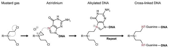 Mustard gases form a highly reactive intermediate—aziridinium. Aziridinium attracts functional groups of proteins and DNA to react with it, which eventually brings about cellular damage. Alkylation of the DNA base guanine by aziridinium results in a cross-linked DNA double strand. Consequently, cellular division cannot occur and the DNA damage results in apoptotic cell death.