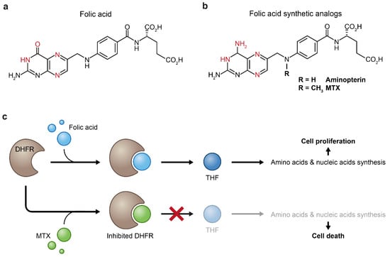 Folic acid (a) and its synthetic analogs (b). Both folic acid and its analogs bind to dihydrofolate reductase (DHFR) through formation of hydrogen bonds (the atoms that form these bonds are in red). Replacement of the enol group of folic acid by an amine group results in increased binding affinity of the synthetic analogs to the DHFR enzyme which inhibits the biosynthesis of tetrahydrofolate (THF) (c). Tetrahydrofolate starvation causes impaired cellular anabolism which eventually leads to cellular death.