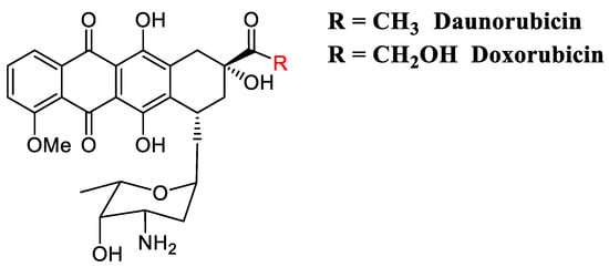 DNA Intercalators are a unique class of biologically active molecules that are usually characterized by planar-polycyclic-aromatic structure with positive charge. Due to their physical features, intercalators easily insert between the planar bases of dsDNA through π-stacking, van der Waals bonds and hydrophobic interactions, resulting in DNA damage and interference with DNA replication [83]. The intercalator-DNA complex is stabilized by electrostatic interactions between positive charges on the intercalator and the negatively charged phosphate backbone of DNA [84,85,86]. Stable DNA-intercalator complexes may lead to inhibition of DNA unwinding enzymes Topo I and Topo II [87,88,89,90], and subsequent DNA damage-induced apoptotic cell death [91]. The fact that intercalators interfere with a basic biological process which is crucial for highly proliferating cancer cells but is silent in most normal tissue cells led to their consideration as highly potent chemotherapeutics. Since the discovery of the DNA intercalation process by L.S. Lerman and his coworkers in 1961 [92], many small-molecule intercalators, both naturally occurring and synthetic, have been evaluated as potential anticancer agents [93,94]. Currently there are several intercalators approved by the FDA for the treatment of different malignancies [83]: Actinomycin D is a bacterial-origin antibiotic that was discovered by S.A. Waksman and H.B. Woodruff in 1940 [95]. Due to its antiproliferative activity, actinomycin D was approved by the FDA in 1964 as a first-in-class anticancer intercalator drug [96]. Following the discovery of actinomycin D, several other antibiotics were isolated from bacteria and found to be potent anticancer agents. Daunorubicin and doxorubicin (Figure 5) are the most representative examples of bacterial-origin anthracycline-intercalators that have been approved as anticancer agents. Since their discovery in the early 1960s and subsequent introduction into the clinic, daunorubicin and doxorubicin are amongst the most active and extensively used anticancer agents [97]. The discovery of intercalating agents as a new class of anticancer drugs significantly contributed to the diversification of combinatorial chemotherapy and enabled improvement of clinical outcomes for hard-to-cure malignancies, such as advanced BC [98,99]. However, the toxicity that is associated with anthracycline chemotherapy, in particular cardiotoxicity [100,101], ultimately limits their clinical application and their use is becoming restricted almost exclusively to high-risk patients [102,103,104].