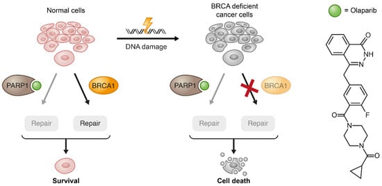 Synthetic lethality, as a concept when two or more genetic lesions cause lethality, originated from studies made in Drosophila almost a hundred years ago [151]. With the increasing ability of modern drug development to target specific biological molecular pathways, synthetic lethality studies have become a powerful tool for identifying strategies for killing genetically defective malignant cells while sparing normal tissues [11]. For instance, treating BRCA1/2-mutated tumors with PARP inhibitors is a classic example of taking advantage of a cancer-specific mutation to selectively kill cancer cells by depriving them of a biological mechanism (DNA damage repair) that compensates for this genetic deficiency (Figure 6) [152,153,154]. So far, the only clinical implementation of the synthetic lethality strategy is through the use of PARP inhibitors for patients with BRCA mutations. However, a set of recently developed techniques such as genome-wide screens and computational approaches are being successfully utilized for the discovery of new synthetically lethal interactions. For example, RNAi high-throughput screens revealed potential synthetic lethality targets in cancers with an aberrant expression of “undruggable” genes like KRAS [155,156] and cMYC [157]. Even in cases where direct inhibition of experimentally revealed hits is not possible, successful inhibition of pathways that are related to undruggable genes can be achieved by using targeted small-molecule inhibitors. For instance, using bortezomib and fasudil to inhibit GATA2-controlled NF-κB and RHO/ROCK signaling pathways, respectively, in the context of mutant KRAS in NSCLC mouse model resulted in impressive tumor regression [158].