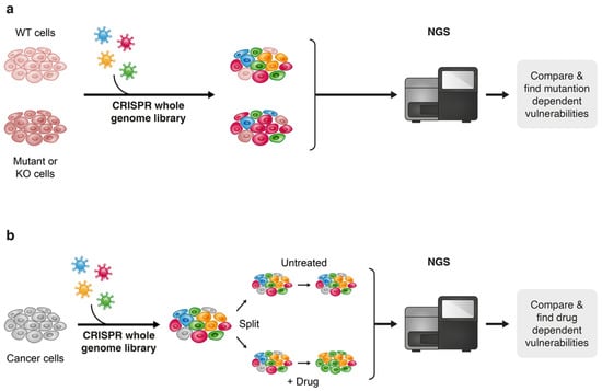 Two approaches towards discovering drug vulnerabilities using CRISPR-Cas9 genome-wide screens: vulnerabilities that are derived from a specific genetic contexts (a) and drug-related vulnerabilities (b).