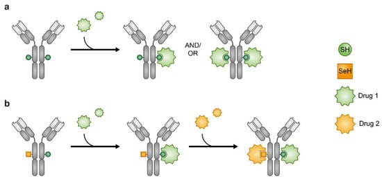 - Li, X.; Patterson, J.T.; Sarkar, M.; Pedzisa, L.; Kodadek, T.; Roush, W.R.; Rader, C. Site-Specific Dual Antibody Conjugation via Engineered Cysteine and Selenocysteine Residues. Bioconjug. Chem. 2015, 26, 2243–2248. [Google Scholar] [CrossRef]