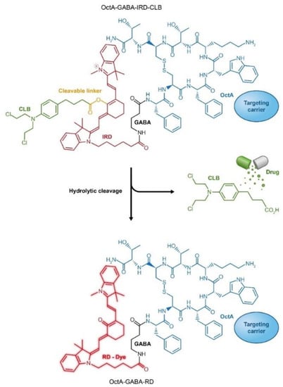Targeted peptide carrier octreotide amide (OctA) loaded with an anticancer drug chlorambucil (CLB) through conjugation to a fluorescent dye IRD, which enables ratiometric measurements of drug release. RD, red dye; IRD, near infra-red (IR) dye.