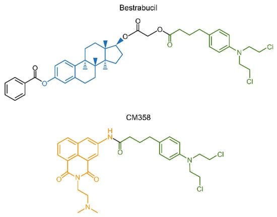 Another interesting approach for conjugation drug therapy involves direct fusion of two drugs into a single molecule. Bestrabucil (Figure 10) represents the first-in-class of such fused molecule achieved by the coupling of an estradiol derivative with CLB. Originally, bestrabucil was designed as a targeted agent with affinity for estrogen receptor-positive (ER+) tumors, but it was found to be active in several ER-negative cancers as well [216]. A similar approach involving direct attachment of two drugs to produce a single chimeric molecule was used to synthesize a small library of dimeric conjugates, each comprising two different chemotherapeutics. One of these chimeras, called CM358, is a fusion between CLB and the topoisomerase II (topo II) inhibitor amonafide (Figure 10). CM358 showed increased cytotoxicity in several cancer models as compared to either of its parent components, probably due to superior inhibition of the amonafide target topo II [217]. In another example, direct conjugation of irinotecan and CLB resulted in a dimeric chimera, which due to the hydrophilic-lipophilic properties of its components assembles into nanoparticles with improved PK/PD and increased antitumor activity [218].