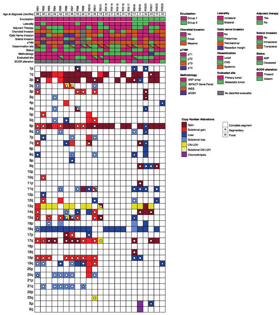 In recent years, copy number alterations (CNA) have been identified for risk assignment and translated to current clinical practice for some pediatric tumors [7,8]. However, the identification of the genomic features of retinoblastoma has focused mostly on intraocular cases and overall genomic features of a limited number of patients with extraocular relapse have been reported in the literature [9,10,11,12,13,14,15,16,17,18,19]. In such studies, other recurrent CNA besides the 13q loss or copy-neutral loss of heterozygosity (CN-LOH), such as gains in chromosomes 1q, 6p, 2p and losses in 16q have been identified in intraocular retinoblastoma, but none has been conclusively related to an increased risk of extraocular relapse. Gain of chromosome 6p, detected during conservative therapy, was identified as a risk factor for enucleation in studies using liquid biopsy from aqueous humor paracentesis [20]. However, despite them being more common in cases with HRPF, their association with extraocular relapse was not established. In addition, only a small percentage of patients present recurrent somatic mutations other than in the RB1 gene such as in BCL6 Corepressor gene (BCOR) seen in 7 to 14% of cases and others which are even less common [10,11,16]. Hence, it is not known whether there are recurrent genomic abnormalities increasing the risk of extraocular relapse that could help in the identification of these higher risk patients before the occurrence of metastatic dissemination, or help interpret its tumorigenesis or mechanisms of tumor progression.