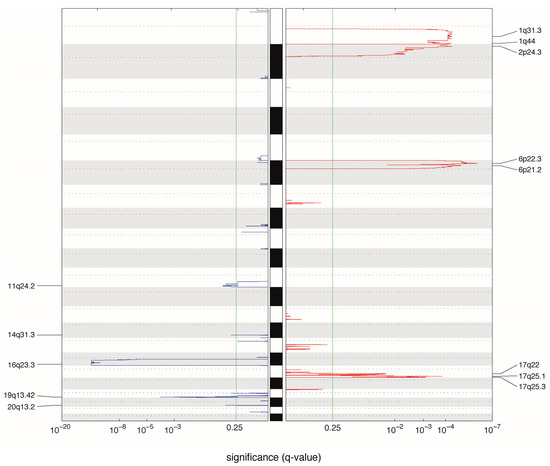 Significantly altered copy number regions identified by GISTIC. A karyogram overview of the cumulative copy number is shown separately for gains (red) and losses (blue) across the genome, depicted in the y-axis. In the x-axis, the GISTIC q-values are shown on a log scale and the green line represents the significance threshold (q-value = 0.25). Significantly altered regions are mentioned on the sides. For this analysis, samples from Hospital Garrahan and Sant Joan de Deu were used. In cases where samples from primary site and metastatic site were available (patients RB5, RB11, RB12 and RB18), only the primary tumor results were considered.