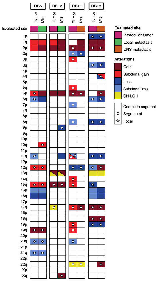 We also analyzed paired samples including the primarily enucleated eye and the metastatic site in four patients. As in neuroblastoma [31], specimens obtained from a relapsed site had a higher number of CNA compared to the primary tumor [35] (and 10 alterations that were found in a subclonal population were seen clonally in the relapse specimen, suggesting clonal evolution. In one case, the 11q deletion was present in both primary tumor and metastatic sites. One patient (RB12), previously reported by our group, showed 11q deletion only in the metastatic site [25]. This phenomenon was also reported for neuroblastoma where it has been reported that 11q deletion may be present only in the relapsed specimen, suggesting clonal evolution at the metastatic site or a subclonal population not detectable in the primary tumor that had the ability to metastasize [31]. In the two remaining cases, a subclonal 11q deletion was detected in the primary tumor and it was not detectable in the metastatic relapse. However, in general, 11q losses were more common in extraocular specimens. These findings and the presence of subclonal alterations seen in many of our cases, suggest intra-tumoral heterogeneity as it was previously described for retinoblastoma and other tumors with subclones capable to metastasize and may acquire additional genomic alterations or lose others at the extraocular site [25,35]. Deeper and single-cell sequencing studies should describe this phenomenon with greater precision.
