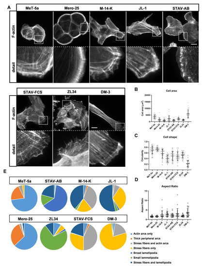 Actin filament organization and cell morphology. Representative images (A) for filamentous actin visualized with TRITC-conjugated phalloidin. Scale bar, 20 µm. (B–D). Quantification of cell area (B), circularity (C) and Aspect Ratio (D) was performed by ImageJ. MeT-5a (n = 25), Mero-25 (n = 20), M-14-K (n = 23), JL-1 (n = 26), STAV-AB (n = 26), STAV-FCS (n = 26), ZL34 (n = 27), DM-3 (n = 27). (E). Analysis of actin organization. 100 cells per cell lines were examined according to the dominant phenotype for each cell. The experiment was performed three times, i.e., in total 300 cells per cell lines were analyzed. One-way ANOVA with Tukey’s post hoc analyses were made to calculate statistical significance in panels (B–D). A complete list of the significances of the data is presented in Table S1.