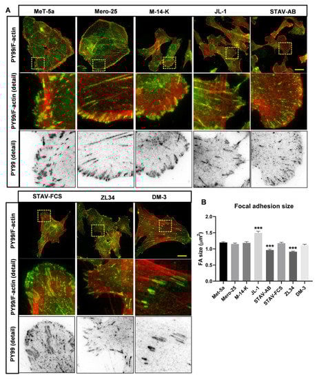 Organization of focal adhesions. (A). Representative images for filamentous actin visualized with TRITC -conjugated phalloidin, and for focal adhesions stained with mouse anti-phosphotyrosine (PY99) antibody followed by a AlexaFluor488-conjugated anti-mouse antibody. Scale bar, 20 µm. (B). Focal adhesion size were calculated using ImageJ. MeT-5a (n = 4415), Mero-25 (n = 3995), M-14-K (n = 2025), JL-1 (n = 1454), STAV-AB (n = 2813), STAV-FCS (n = 2733), ZL34 (n = 5637), DM-3 (n = 2513). Error bars denotes standard error of mean. One-way ANOVA with Tukey’s post hoc analyses were made to calculate statistical significance. *** = p < 0.001 marks the statistical significant difference compared to MeT-5a. A complete list of the significances of the data is presented in Table S2.