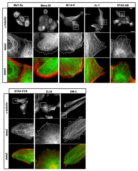 To visualize organization of the microtubules (MTs), the MM cells were stained with an antibody against α-tubulin. There were marked differences in the organization of microtubules between the different cell lines, MeT-5a, M-14-K, JL-1, STAV-FCS and DM-3 had prominent MTs all the way to the cell periphery (Figure 3). Mero-25 cells also had an accumulation of MTs at the cell edge, but they did not reach all the way to the cell edge due to the presence of the broad zone of cortical actin arcs (Figure 3). STAV-AB and ZL34 differed in the MT organization. In both of these cell lines, only a few individual MTs reached to the cell edge, which could indicate that their MTs are under a more dynamic regime.