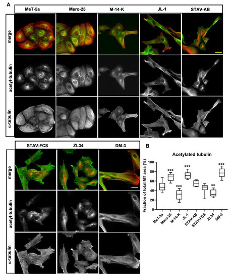 Organization of stable microtubules. (A) Stable microtubules were visualized with a mouse antibody against acetylated tubulin followed by an AlexaFluor488-conjugated goat anti-mouse antibody (for MeT-5a, Mero-25, M-14-K, JL-1 and DM-3) or an AlexaFluor568-conjugated goat anti-mouse antibody (for STAV-AB, STAV-FCS and ZL34). Microtubules were visualized with a rabbit antibody against acetylated tubulin followed by an AlexaFluor568-conjugated donkey anti-rabbit antibody (for MeT-5a, Mero-25, M-14-K, JL-1 and DM-3) or an AlexaFluor488-conjugated goat anti-rabbit antibody (for STAV-AB, STAV-FCS and ZL34). Scale bar, 20 µm. (B) The proportion of the microtubules that are also positive for acetylated tubulin was examined by microscopy imaging. Ten images from three independent experiments for each cell line were analyzed using ImageJ. One-way ANOVA with Tukey’s post hoc analyses were made to calculate statistical significance. ** = p < 0.01 and *** = p < 0.001 mark the statistical significant difference compared to MeT-5a. A complete list of the significances of the data is presented in Table S3.