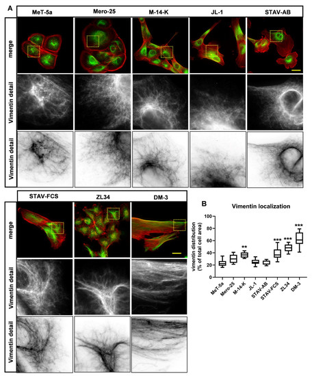 Organization of vimentin filaments. (A). Representative images vimentin intermediate filaments visualized with a mouse anti-vimentin antibody followed by an AlexaFluor488-conjugated anti-mouse antibody. Filamentous actin visualized with TRITC-conjugated phalloidin, Scale bar, 20 µm. (B). The cell area occupied by vimentin filaments was examined by microscopy imaging. Ten images from three independent experiments for each cell line were analyzed using ImageJ. One-way ANOVA with Tukey’s post hoc analyses were made to calculate statistical significance. ** = p < 0.01 and *** = p < 0.001 mark the statistical significant difference compared to MeT-5a. A complete list of the significances of the data is presented in Table S4.