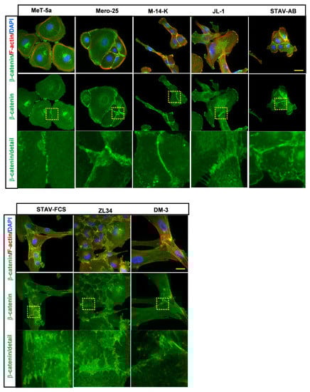 To visualize cell:cell contacts, the MM cell lines were stained with an antibody against β-catenin. This protein links to cadherins and to α-catenin at adherence junctions, which is the core protein complex in these cell:cell contact areas [21]. In the MeT-5a, Mero-25, M-14-K and STAV-AB cell lines, β-catenin was accumulated at the cell junctions, which is the predominant β-catenin localization found in epithelial cells (Figure 6). These findings indicate that these cell lines have epithelial cell-like properties. In contrast, the JL-1, STAV-FCS, ZL34 and DM-3 had fewer points of contacts and β-catenin was found at the cell periphery and in membrane ruffles and to a lesser extent in cell junctions (Figure 6). This mode of β-catenin organization is usually associated with fibroblastic cells [21].