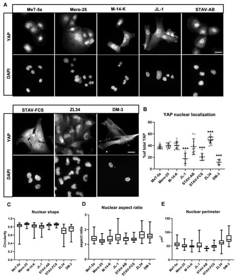 YAP nuclear localization and nuclear shape. (A,B). Representative images (A) and quantification (B) of YAP nuclear localization analyzed by immunofluorescence microscopy after visualization with a mouse anti-YAP antibody followed by an AlexaFluor488-conjugated anti-mouse antibody. Nuclei were visualized with DAPI. Scale bar, 20 µm. The Proportion of nuclear YAP nuclear YAP over the total cellular YAP was deduced from the microscopy images using ImageJ. MeT-5a (n = 10), Mero-25 (n = 12), M-14-K (n = 15), JL-1 (n = 9), STAV-AB (n = 8), STAV-FCS (n = 8), ZL34 (n = 19), DM-3 (n = 6). (C–E). Quantification of nuclear shape (circularity, C), aspect ratio (D) and perimeter (E) was performed by ImageJ. MeT-5a (n = 72), Mero-25 (n = 62), M-14-K (n = 92), JL-1 (n = 68), STAV-AB (n = 77), STAV-FCS (n = 50), ZL34 (n = 94), DM-3 (n = 59). One-way ANOVA with Tukey’s post hoc analyses were made to calculate statistical significances of the data in panel (B–E). *** = p < 0.001 mark the statistical significant difference compared to MeT-5a. A complete list of the significances of the data is presented in Table S5.