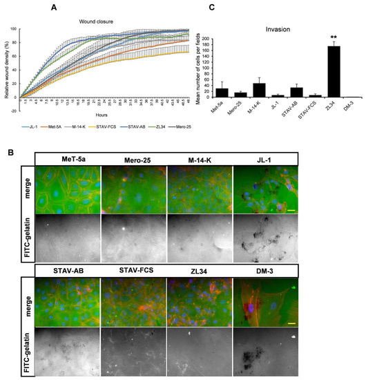 Next, the migratory and invasive properties of the MM cell lines were tested. First, we investigated how the MM cells behaved in the so-called wound-closure assay. In this case, the wound-closure was analyzed using the IncuCyte imaging system. Cells were seeded in 96 well-plates, and the Wound Maker device was used to inflict wounds of equal size, after which the wound closure was monitored for 48 h. The DM-3 cells could not be studied by this method since the cells did not form confluent monolayers. The other cell lines could be divided into three groups: the normal mesothelial cell line MeT-5a reached 80% wound density after 44 h and wound of STAV-FCS cells were only closed to 66% after 48 h (Figure 8A). In contrast, STAV-AB and ZL34 reached 80% wound density after 15.5 h and 18.5 h, respectively. The remaining three cell lines tested had an intermediate efficiency to reach 80% relative wound density: M-14-K 33 h, JL-1 29.5 h and Mero-25 26.5 h (Figure 8A).