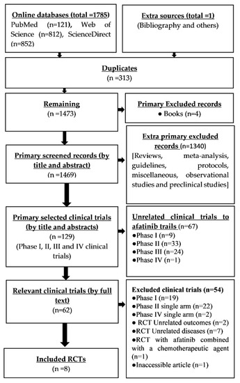 The search syntax of keywords was: “Afatinib” AND “Non-Small Cell Lung Cancer”; “Afatinib” AND “Squamous Cell Carcinoma of Head and Neck”; “Afatinib” AND “Randomized Controlled Trial”; “Afatinib”. Pertinent records were retrieved from PubMed, Web of Science, and ScienceDirect databases, while the timeframe applied was from 2011 up to August 2020 in all databases. No filters were applied regarding languages or countries to avoid language bias. In the PubMed database, the retrieved records were filtered by Clinical Trial, Phase 1 Clinical Trial, Phase II Clinical Trial, Phase III Clinical Trial, Phase IV Clinical Trial, and RCT, while reviews and books were excluded. In the Web of Science, the selected records were refined by selecting journal articles. In ScienceDirect, the retrieved records were filtered by research articles only. To identify extra records, the search was extended to checklists of references in the published studies, online libraries (Springer, Wiley, Elsevier, MDPI, and J-Stage), National Cancer Institute, U.S. National Library of Medicine (ClinicalTrials.gov), National Technical Information Service (NTIS), International Clinical Trials Registry Platform (ICTRP), Cochrane, and TRIP Medical Database. For grey literature and to avoid publication bias, several open-access databases including MedNar, OpenGrey, and Google Scholar were searched to retrieve unpublished relevant RCTs. For inaccessible articles, the university library or authors were contacted. The total results from each online database and extra sources were recorded in a flow chart diagram of PRISMA. Finally, the number of results from each database was recorded. The retrieval of records was independently performed by two researchers (N.M. and A.A.). Discrepancies were discussed with a third investigator (M.B.A.).